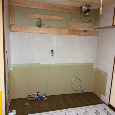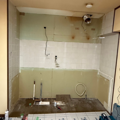 既存のキッチンを撤去し、配管や下地を確認しながら新しいキッチンを設置。